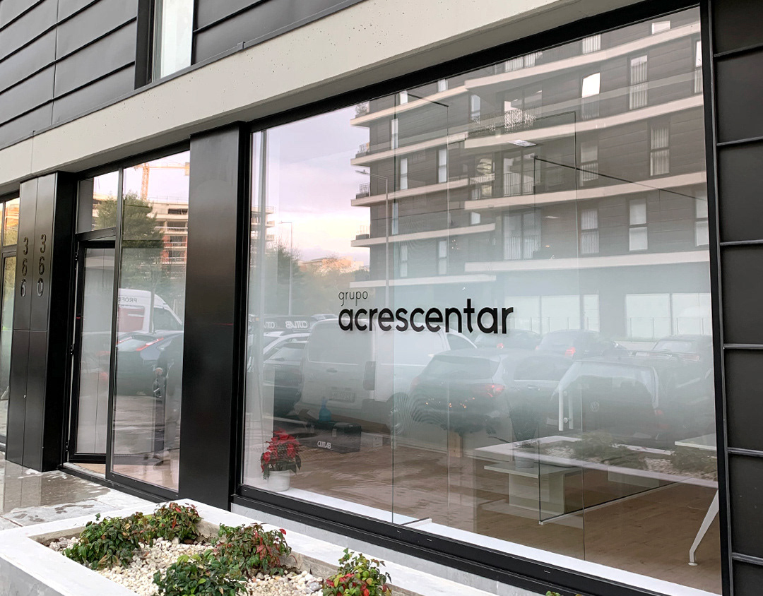 Películas Névoa e imagem da marca aplicados nos escritórios do Grupo Acrescentar - Porto